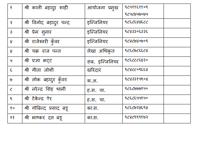 गृहपृष्ठ हाम्रो बारेमा कर्मचारी विबरण उदेश्य उपलब्धीहरु योजना तथा कार्यक्रमहरु डाउनलोड फोटो ग्यालरी सम्पर्क X कर्मचारी विबरणसंगठन संरचना आयोजना कर्मचारीहरुको विवरण :